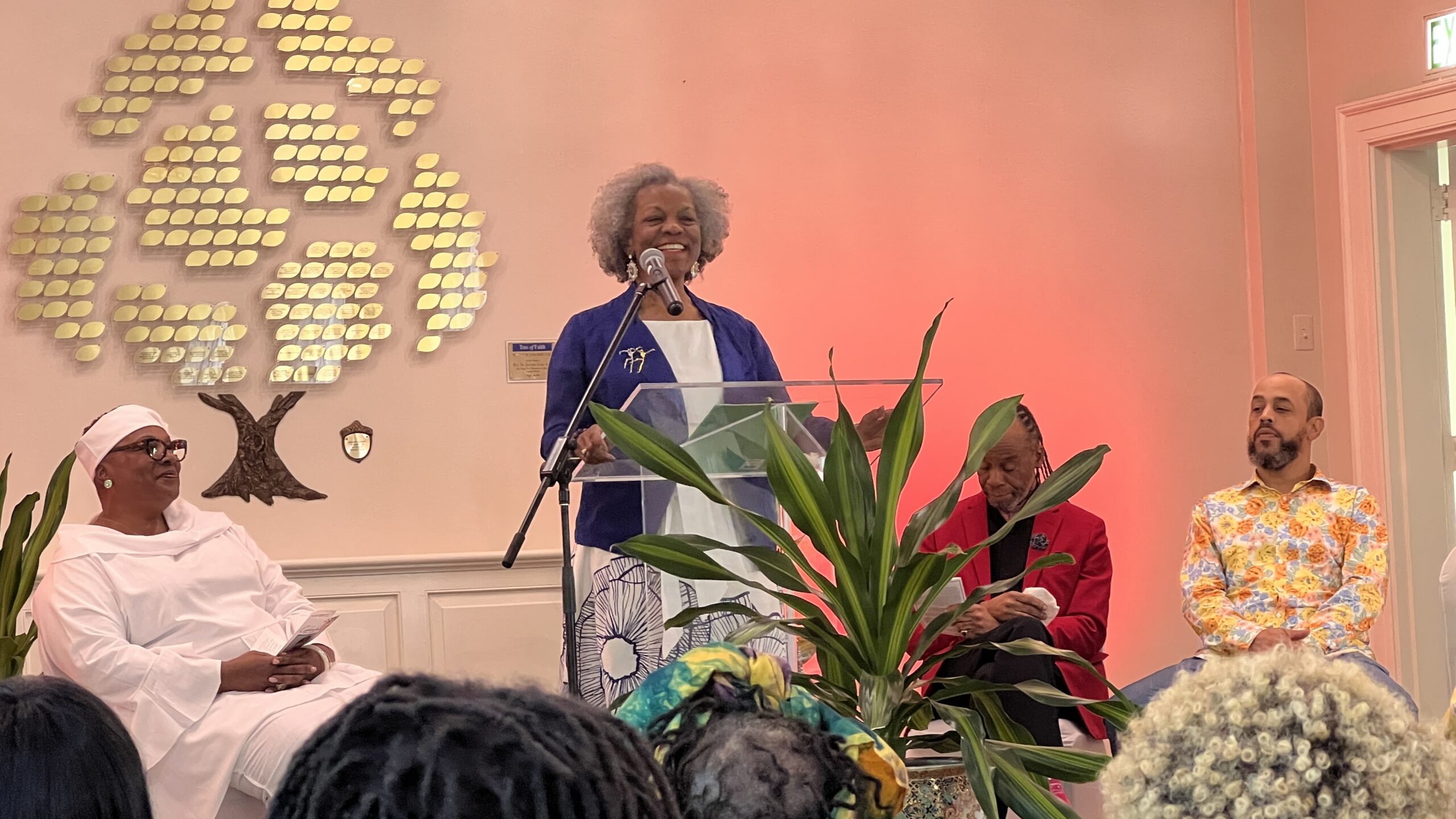 Nancy Havera, Spring Forest Teacher, speaking at the celebration via video.