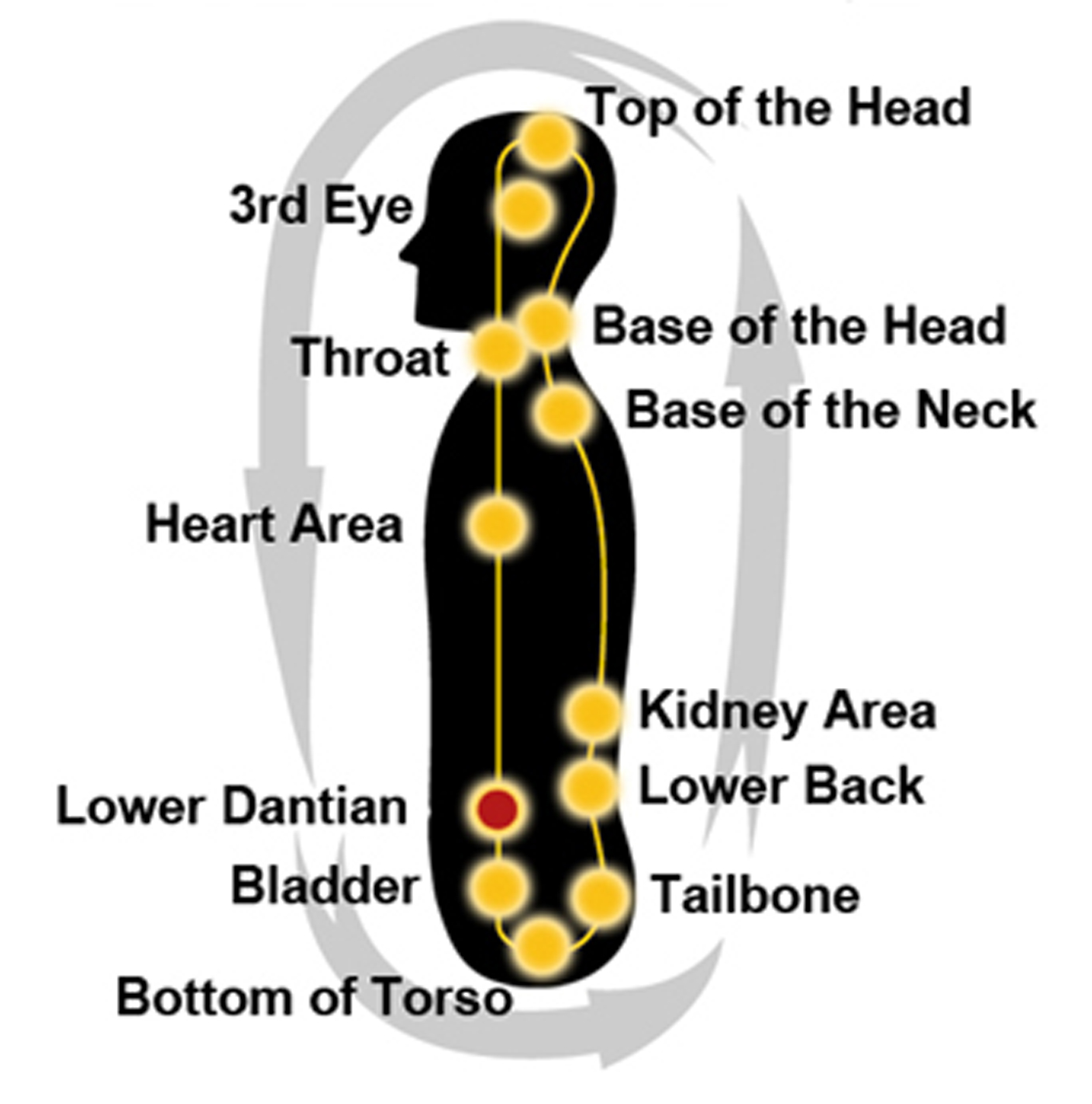 In Spring Forest Qigong, we learn that the front and back channels are the most important. When you raise your tongue to the roof of your mouth, you connect the two channels. This is the first step in opening the Small Universe. Along this main loop of energy channels is a series of very important vital energy centers, which we focus on during the Small Universe Meditation.