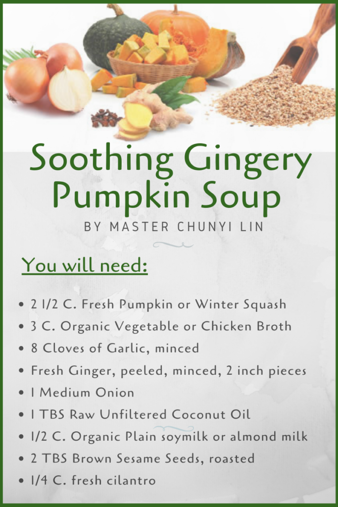 Soothing Gingery Pumpkin Soup BENEFITS: Good for maintaining healthy lungs and large intestine Serves 2 Ingredients 2 1/2 cups of coarsely chopped fresh pumpkin or winter squash 3 cups of organic vegetable or chicken broth 3 cloves of garlic peeled and minced 5 whole cloves 2 inch piece of fresh ginger peeled and […]