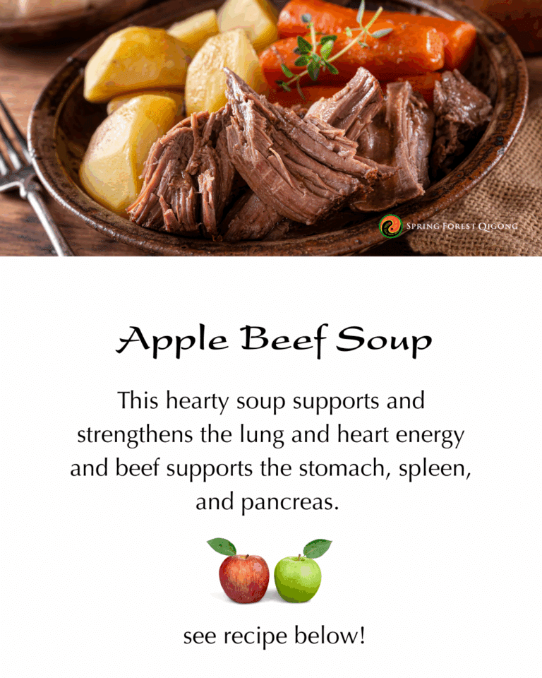 Apple Beef Soup BENEFITS: This hearty soup supports the lungs, stomach, spleen, and pancreas. When made with oil, it also benefits the heart. Beef is particularly nourishing for the stomach, spleen, and pancreas, making it a great choice for those who are not vegetarian. Serves 4-6 Ingredients 2 apples (1 green, 1 red) ½