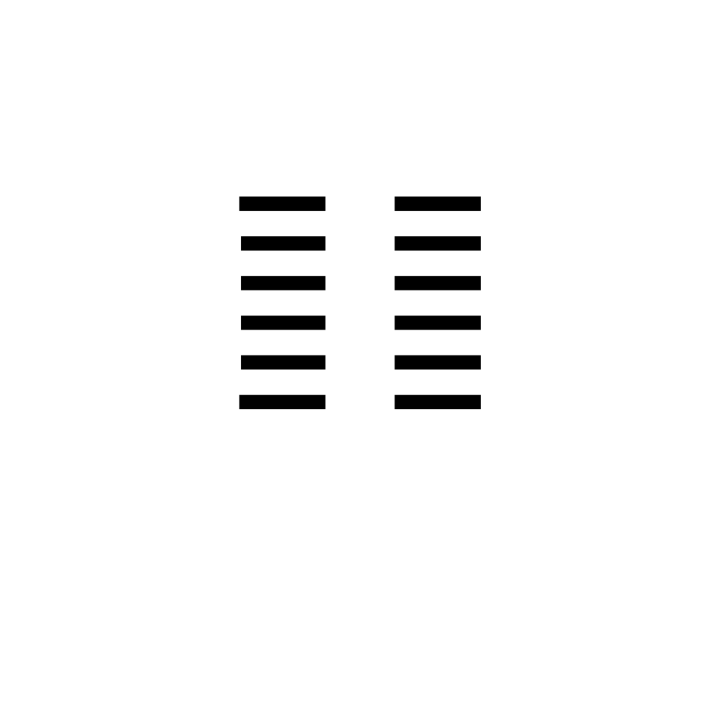 One of the four timeless hexagrams. Pure yin. Represents receptivity, submission, humility, obedience, yielding, flexibility, stillness, essence, innate capacity.